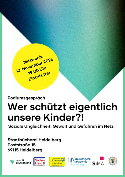 Am Mittwoch, 12.11.2025 um 19:00 Uhr findet im Hilde-Domin-Saal der Stadtbücherei Heidelberg ein Podiumsgespräch zum Thema Kinderschutz und Kinderrechte unter dem Titel "Wer schützt eigentlich...unsere Kinder?!" statt. Auf dem Podium nehmen Platz: Yannic Frey (Landesanstalt für Kommunikation), Kübra Göksel (Muslimische Akademie Heidelberg) und Volker Schuld (Kinderschutzzentrum Heidelberg); moderiert wird die Diskussion von Dzeneta Isakovic (Mosaik Deutschland e.V.). Zu Beginn des Abends heißt Renato Gigliotti, Polizeivizepräsident des Polizeipräsidiums Mannheim die Gäste willkommen. Alle Mitglieder sowie interessierte Bürgerinnen und Bürger sind herzlich eingeladen an der Kooperationsveranstaltung von SicherHeid e.V., KKP Rhein-Neckar e.V., SiMA e.V., Mosaik Deutschland e.V. sowie dem Polizeipräsidium Mannheim teilzunehmen. Eine Anmeldung ist nicht erforderlich.